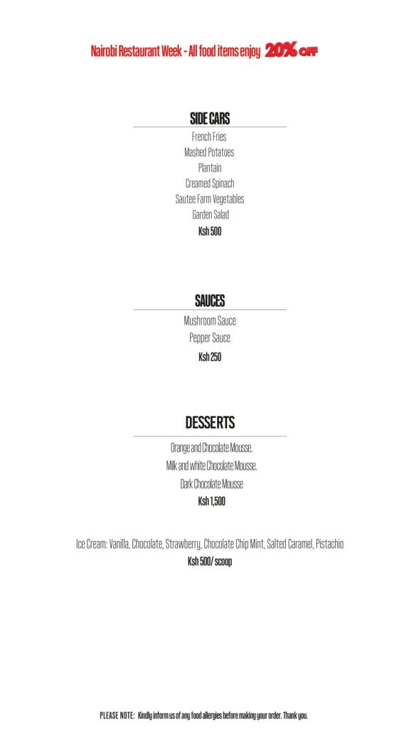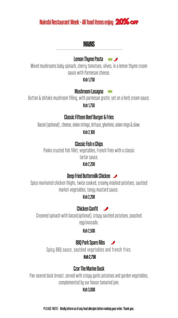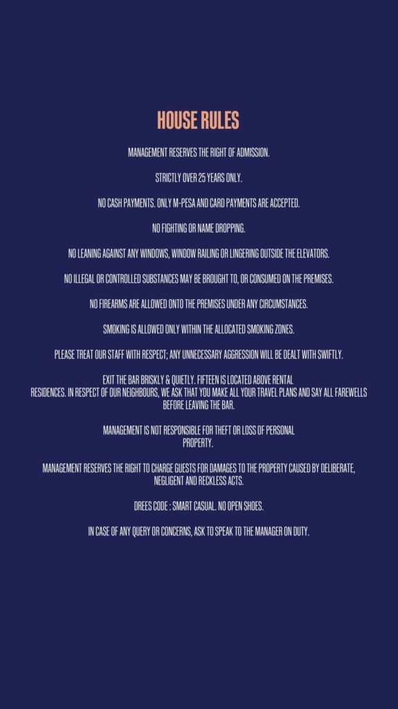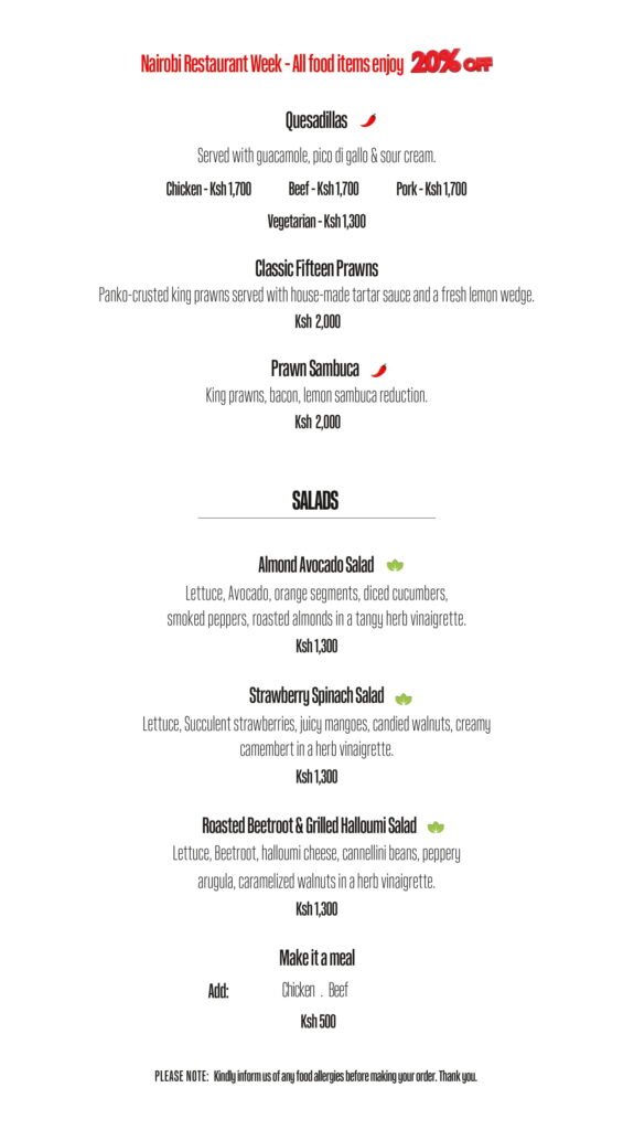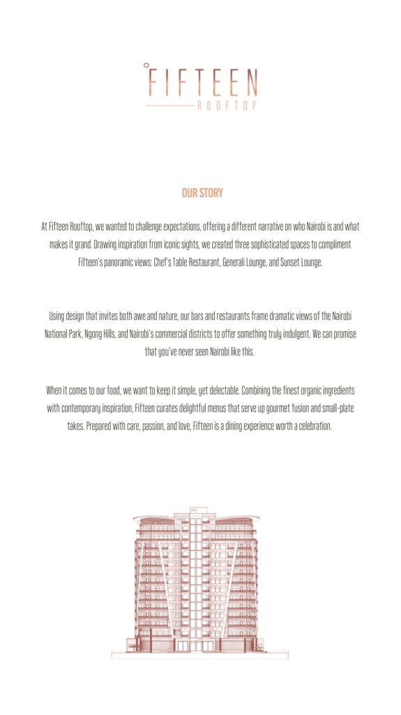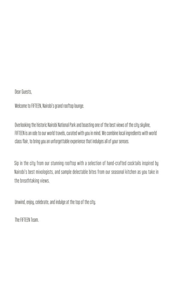 At Fifteen Rooftop, we wanted to challenge perceptions and push the envelope by offering a different narrative on who Nairobi is and what makes it special. Drawing inspiration from iconic sights, we created three sophisticated spaces to complement Fifteen’s panoramic views: Chef’s Table Restaurant, Generali Bar, and Sunset Lounge. When it comes to our food, we like to keep it simple, yet delicious by combining the finest organic ingredients with contemporary inspiration. Fifteen curates tasty menus serving gourmet fusion and tapas dishes, prepared with passion and love.