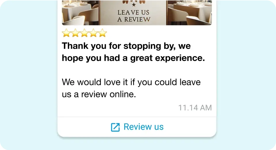 Invite your customers to share their thoughts and suggestions directly with you via WhatsApp – helping you gather valuable insights and continuously improve your operations.